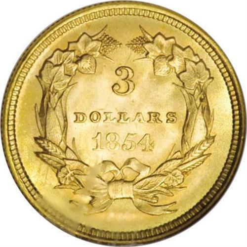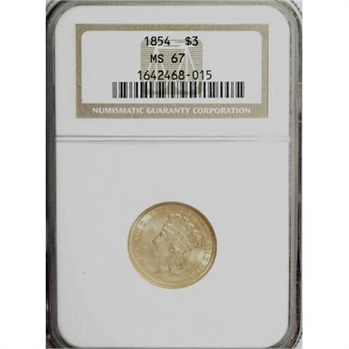 <B>1854 $3 MS67 NGC.</B></I> February 21, 1853, was an important date in the history of American numismatics. Congress enacted legislation to reduce the weight of minor silver coinage, also authorizing the issuance of three dollar gold pieces. Section 7 of the Mint Act of that date read: "And be it further enacted, that from time to time there shall be struck and coined at the Mint of the United States, and the branches thereof, conformably in all respects to law, and conformably in all respects to the standard of gold coins now established by law, a coin of gold of the value of three dollars, or units, and all the provisions of an act entitled 'An act to authorize the coinage of gold dollars and double eagles,' approved March third, eighteen hundred and forty nine, shall be applied to the coin herein authorized, so far as the same may be applicable; but the devices and shape of the three dollar piece shall be fixed by Secretary of the Treasury."<BR> The obverse features an Indian princess facing left, wearing a feathered headdress with a beaded band inscribed LIBERTY. Around is the statutory legend UNITED STATES OF AMERICA. The reverse has an agricultural or cereal wreath enclosing the date and denomination. The letters in the denomination DOLLARS are smaller and shorter than the date digits, the only year where that occurred (and technically making this a one-year design subtype). James B. Longacre duplicated the design for this coinage issue, with the appropriate denomination change, for the new type of gold dollar.<BR> This impressive example offers fully brilliant yellow-gold luster and frosty obverse and reverse surfaces. A few tiny obverse ticks by the nose are the only notable marks on this essentially flawless coin. All design elements are sharply impressed, with excellent detail. An important opportunity awaits the patient and aggressive bidder. The single finest example of the issue graded at NGC (12/07); PCGS has certified two MS67s, with one finer.<BR><I>From The Madison Collection.</B></I><BR><BR><B>Coin Engraver:</B> James B. Longacre<BR><BR><b>Shipping:</b> Coins & Currency (<a target="_blank" href="http://www.heritageauctions.com/common/shipping.php">view shipping information</a>)