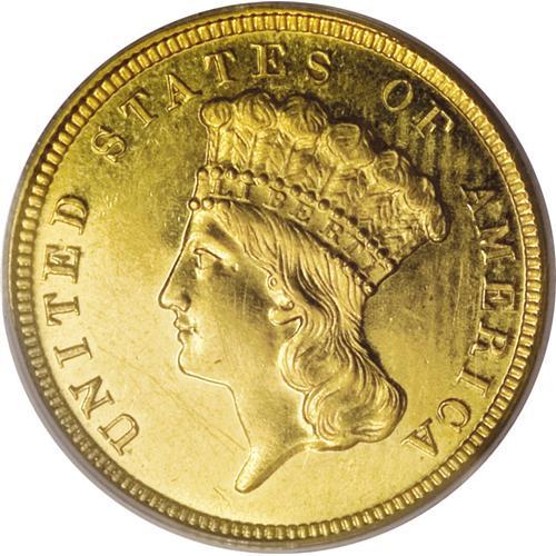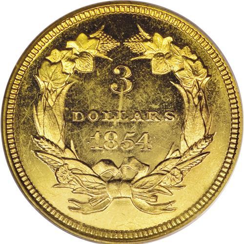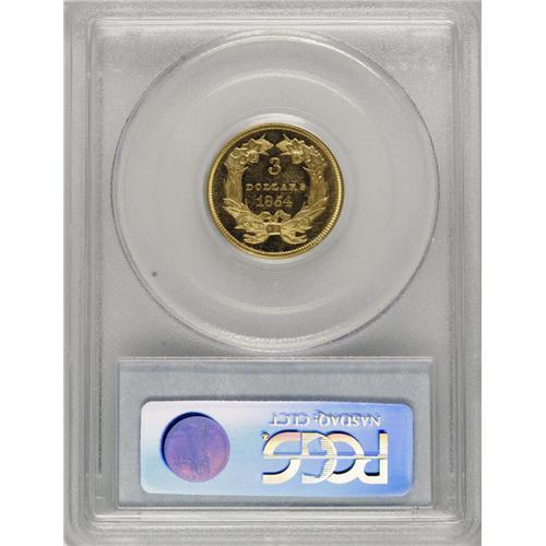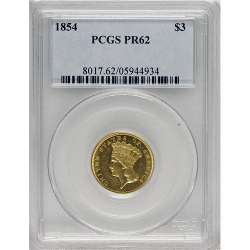 <B>1854 $3 PR62 PCGS.</B></I> The exact number of 1854 proof three dollar coins minted is unknown. From 1854 through 1858 the Mint did not record the number of proof gold pieces struck each year. This lack of proper recordkeeping changed in 1859 as demand for mint products increased, thanks partly to the new small cents. The increased demand for proof coins produced a need for a more structured system of producing, documenting, and marketing proof issues. In his <I>Encyclopedia of United States and Colonial Proof Coins,</B></I> Walter Breen notes a document indicating that Mint Director Snowden sent 15 "specimens" to the Secretary of the Treasury, a document Breen found in the National Archives giving the manufacture date of April 28, 1854. This is significant, since regular coinage of the 1854 three dollar gold began a few days later, on May 1. If it could be proven that only 15 proofs dated 1854 were struck, then ownership of a proof of this year would mean possession of one of the first three dollar pieces ever minted, since 1854 is the first year for this peculiar denomination.<BR> However, experts generally agree that more than 15 proofs were issued in 1854. Breen even suggests a mintage of "15+" in his 1977 reference on the subject. One theory is that restrikes must have been made later in the year since more than one die pair was utilized to produce 1854 proof threes. Breen actually identifies two different obverse dies and the Garrett & Guth reference on U.S. gold coinage suggests that two different reverse dies were used, although this may be a typographical error. Despite those earlier efforts, recent research suggests that only one die marriage was used for the 1854 proofs, which can be substantiated with image-overlay technology. For numismatists today, the exact mintage is perhaps less important than the number of survivors. The combined population of 1854 three dollar proofs NGC and PCGS have graded is, coincidentally, 15, which certainly includes at least a few resubmissions. Auction records reveal a similar number of different examples of this rare-date proof.<BR> The obverse of this coin reveals a few light handling marks in the right obverse field, along with a tiny dark toning spot midway between the E in AMERICA and the headdress. A long scratch runs from the I in UNITED to the bottom of the neck, and a tiny planchet lamination is just behind Liberty's eye. The reverse appears considerably nicer than the obverse, with much field-device contrast and a high-end appearance for the grade. A historic and important coin with an equally illustrious pedigree. Population: 3 in 62, 4 finer (5/07).<BR><I>Ex: Paramount (11/1967), lot 796; John Jay Pittman Collection (David Akers, 5/1998), lot 1886.</B></I><BR><BR><b>Shipping:</b> Coins & Currency (<a target="_blank" href="http://www.heritageauctions.com/common/shipping.php">view shipping information</a>)
