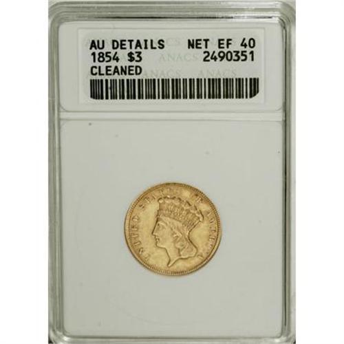 <B>1854 $3 --Cleaned--ANACS. AU Details, Net XF40.</B></I> NGC Census: (46/2807). PCGS Population (66/2093). Mintage: 138,600. Numismedia Wsl. Price for NGC/PCGS coin in XF40: $950. (#7969)<BR><BR><B>Coin Engraver:</B> James B. Longacre<BR><BR><b>Shipping:</b> Coins & Currency (<a target="_blank" href="http://www.heritageauctions.com/common/shipping.php">view shipping information</a>)