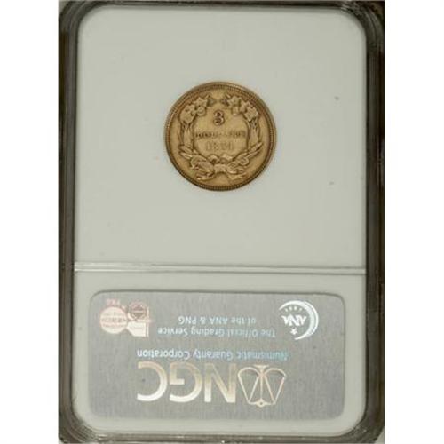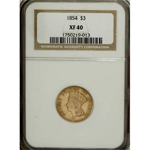 <B>1854 $3 XF40 NGC.</B></I> This first-year issue saw the highest mintage of the three dollar gold series, at 138,600 pieces. This example has typically worn surfaces with a few moderate marks on the obverse, and a smoother reverse. An attractive coin for the grade. <BR><BR><B>Coin Engraver:</B> James B. Longacre<BR><BR><b>Shipping:</b> Coins & Currency (<a target="_blank" href="http://www.heritageauctions.com/common/shipping.php">view shipping information</a>)