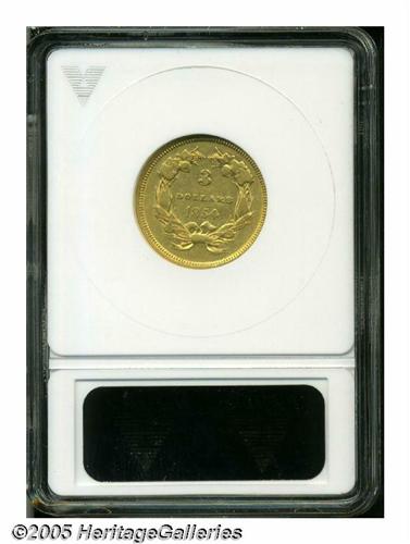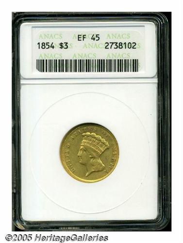 <B>1854<$3> XF45 ANACS.</B></I> First year of issue for the denomination, and a technical one-year type coin with small letters in DOLLARS. Muted luster is seen in the protected areas with attractive greenish-gold color and pleasing, relatively mark-free surfaces.