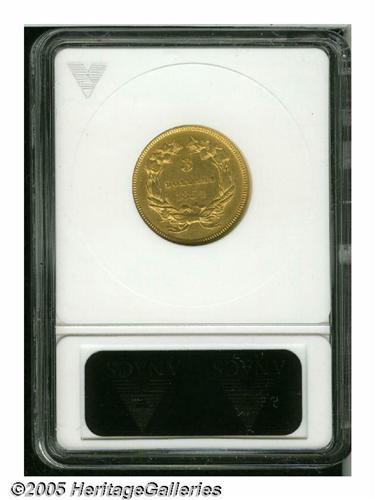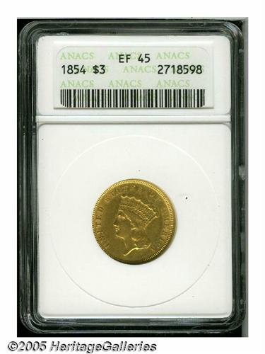 <B>1854<$3> XF45 ANACS.</B></I> Perhaps very lightly cleaned with wispy blemishes as evidence, but still highly attractive with considerable luster still present.<BR><I>From the Dr. Kurt Peters Collection.</B></I> From the Dr. Kurt Peters Collection.
