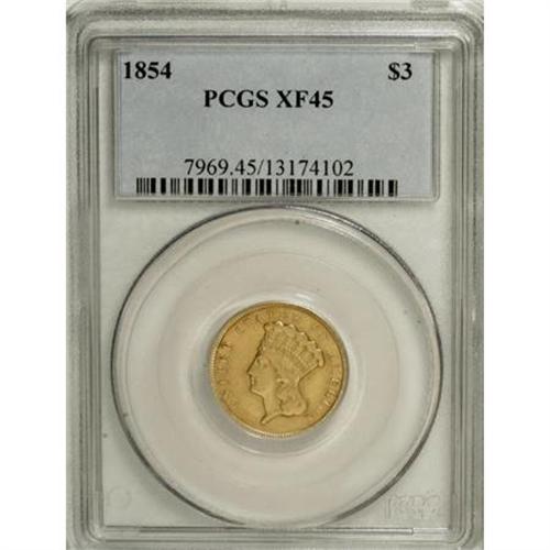 <B>1854 $3 XF45 PCGS.</B></I> Yellow-gold and tan surfaces reveal occasional wisps of light green, and traces of luster in the protected areas. Sharp definition is noted on the design features, though smoothness in portions of Liberty's hair is associated with the typically incomplete strike in that area. Some light circulation marks over each side are not bothersome. Many pieces were probably saved in this first year of issue.<BR><BR><b>Shipping:</b> Coins & Currency (<a target="_blank" href="http://www.heritageauctions.com/common/shipping.php">view shipping information</a>)