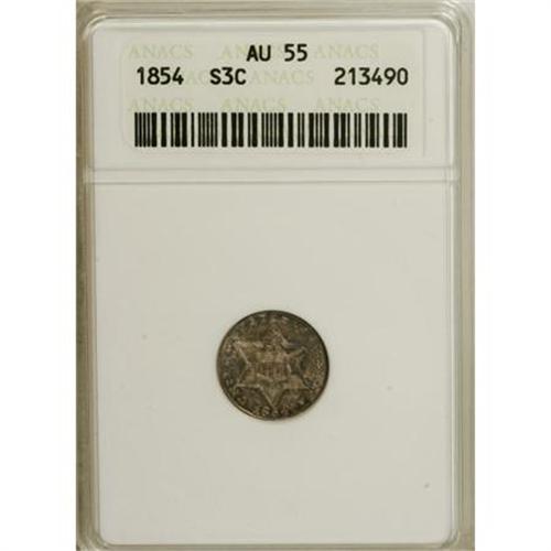 <B>1854 3CS AU55 ANACS.</B></I> NGC Census: (6/239). PCGS Population (30/252). Mintage: 671,000. Numismedia Wsl. Price for NGC/PCGS coin in AU55: $242. (#3670)<BR><BR><B>Coin Engraver:</B> James B. Longacre<BR><BR><b>Shipping:</b> Coins & Currency (<a target="_blank" href="http://www.heritageauctions.com/common/shipping.php">view shipping information</a>\)