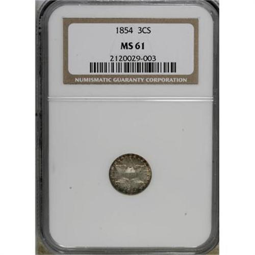 <B>1854 3CS MS61 NGC.</B></I> NGC Census: (12/211). PCGS Population (2/226). Mintage: 671,000. Numismedia Wsl. Price for NGC/PCGS coin in MS61: $390. (#3670)<BR><BR><B>Coin Engraver:</B> James B. Longacre<BR><BR><b>Shipping:</b> Coins & Currency (<a target="_blank" href="http://www.heritageauctions.com/common/shipping.php">view shipping information</a>)