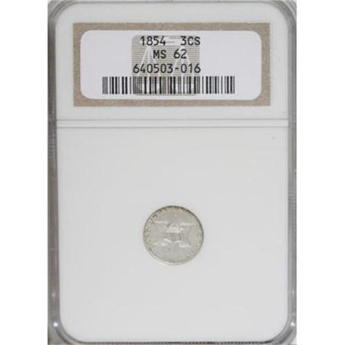 <B>1854 3CS MS62 NGC.</B></I> NGC Census: (43/161). PCGS Population (36/179). Mintage: 671,000. Numismedia Wsl. Price for NGC/PCGS coin in MS62: $475. (#3670)<BR><BR><B>Coin Engraver:</B> James B. Longacre<BR><BR><b>Shipping:</b> Coins & Currency (<a target="_blank" href="http://www.heritageauctions.com/common/shipping.php">view shipping information</a>\)