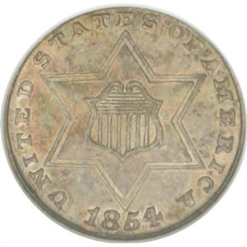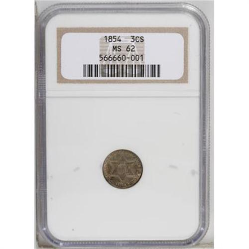 <B>1854 3CS MS62 NGC.</B></I> NGC Census: (42/156). PCGS Population (35/163). Mintage: 671,000. Numismedia Wsl. Price: $475. (#3670)<BR><BR><B>Coin Engraver:</B> James B. Longacre<BR><BR><b>Shipping:</b> Coin/Currency (<a target="_blank" href="http://www.heritageauctions.com/common/shipping.php">view shipping information</a>)