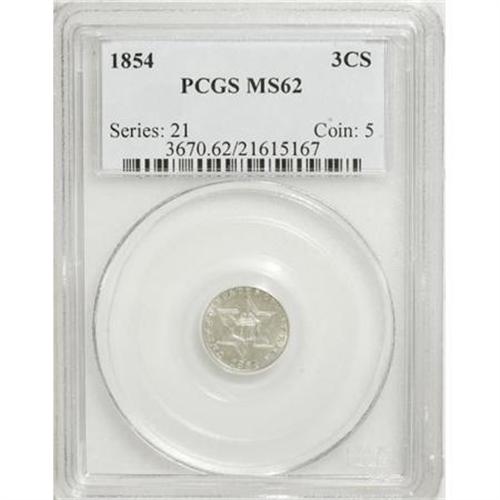 <B>1854 3CS MS62 PCGS.</B></I> PCGS Population (35/185). NGC Census: (43/163). Mintage: 671,000. Numismedia Wsl. Price for NGC/PCGS coin in MS62: $475. (#3670)<BR><BR><B>Coin Engraver:</B> James B. Longacre<BR><BR><b>Shipping:</b> Coins & Currency (<a target="_blank" href="http://www.heritageauctions.com/common/shipping.php">view shipping information</a>)