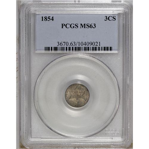 <B>1854 3CS MS63 PCGS.</B></I> Rich rose, plum, and gold toning covers much of this lustrous trime. Well struck with minor marks and a streak of dark toning from 7 o'clock on the reverse to the center.<BR><BR><b>Shipping:</b> Coin/Currency (<a target="_blank" href="http://www.heritageauctions.com/common/shipping.php">view shipping information</a>)