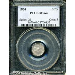 <B>1854<3CS> MS64 PCGS.</B></I> This is the first-year of issue for the Type II design three-cent silver coin, adding a doubled border around the star. The composition also changed from 75% silver to 90% or coin silver. This is a Choice Mint State example with brilliant silver surfaces and just a trace of iridescent toning. <BR><BR><B>Important notice:</B> Heritage usually auctions material at the rate of 200-250 lots per hour. On some occasions eBay Live bid software or the Internet may not be able to keep up with the pace of the auction. We recommend placing a realistic absentee bid now as insurance to avoid disappointment. Occasionally the auctioneer may eliminate or reject an eBay Live bid, and the auctioneer may also reopen a lot after the close of the eBay live bidding (usually because we missed an audience bid), and may reject your bid even if it shows you as the winning bidder. By bidding via eBay Live, you agree that Heritage may award the lot to another bidder at its sole discretion under the circumstances described above or any other reasonable circumstances. Since eBay bids are not shown to us until we open the lot on the floor, we treat those bids just like floor bids. In most cases the floor responds before the eBay bid is presented to us, due to Internet lag time, so for consistency we have made it a policy that floor bids are always considered first over tie eBay live bids. Also please note that all Heritage lots purchased through eBay Live carry a 20% Buyer's Premium. Please make sure you read the Terms and Conditions before you bid.