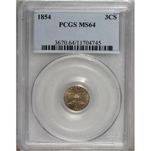 <B>1854 3CS MS64 PCGS.</B></I> Both sides of this appealing near-Gem example are boldly struck, and the reverse design elements are particularly sharp. Light champagne and lilac toning enhances the visual appeal of the piece. Five radial die cracks are counted on the obverse, and both sides display faint die clashing. <BR><BR><B>Coin Engraver:</B> James B. Longacre<BR><BR><b>Shipping:</b> Coins & Currency (<a target="_blank" href="http://www.heritageauctions.com/common/shipping.php">view shipping information</a>)