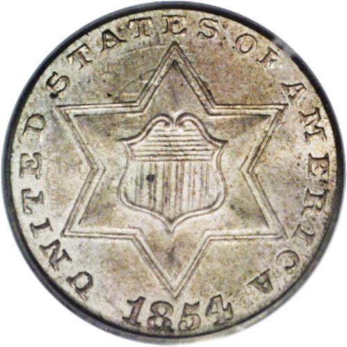 <B>1854<3CS> MS65 PCGS.</B></I> A Gem example of the Type Two design in an older green-label PCGS holder. This beauty has rich gold and ivory color over frosty surfaces. Light clash marks are visible in the fields on both sides of this example. Only a few finer examples of this date have been certified. Population: 34 in 65, 8 finer (8/06).<BR><I>From The Troy Wiseman Collection.</B></I>