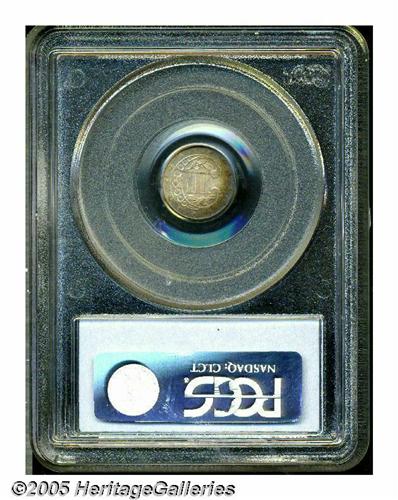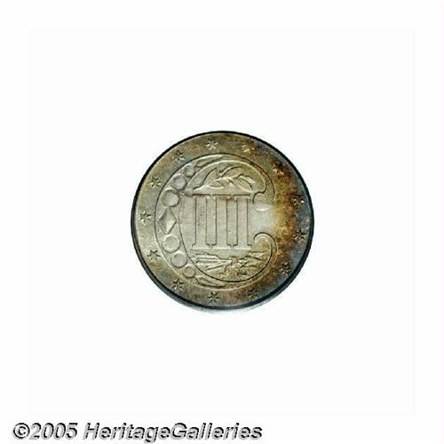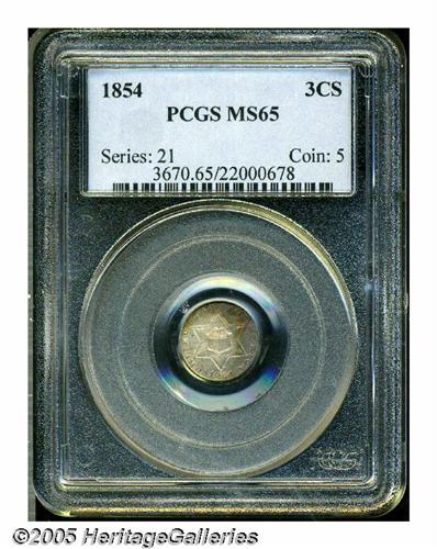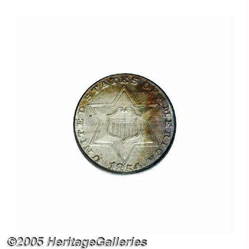 <B>1854<3CS> MS65 PCGS.</B></I> First year of the Type Two design and one of the most challenging issues in the series, especially in Gem condition. This piece has a remarkably strong strike for the type (except, of course, on the reverse stars), and the mint luster is full and frosted. Each side has deep golden-brown patina with gunmetal-blue accents on the reverse. A couple of horizontal die cracks are seen on the obverse and there is just the slightest evidence of die clashing in the fields, normally a very pronounced feature on Three Cent Silver pieces.