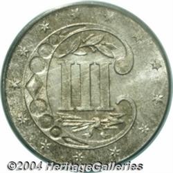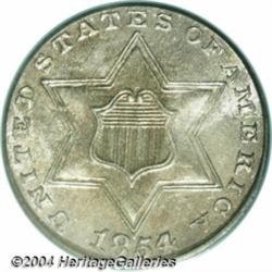 <table><tr><td><table><tr><td>1854 3CS MS65 PCGS. First year of the Type Two design and one of the most challenging issues in the series, especially in Gem condition. This piece has a remarkably strong strike for the type (except, of course, on the reverse stars), and the mint luster is full and frosted. Each side has pale ice-blue patina with an irregular overlay of golden-brown patina. A couple of horizontal die cracks are seen on the obverse and there is just the slightest evidence of die clashing in the fields (normally a very pronounced feature on three cent silver pieces).From the Robert Bowling Collection. <BR><BR><B>Important notice:</B> Heritage usually auctions material at the rate of 200-250 lots per hour. On some occasions eBay Live bid software or the Internet may not be able to keep up with the pace of the auction. We recommend placing a realistic absentee bid now as insurance to avoid disappointment. Occasionally the auctioneer may eliminate or reject an eBay Live bid, and the auctioneer may also reopen a lot after the close of the eBay live bidding (usually because we missed an audience bid), and may reject your bid even if it shows you as the winning bidder. By bidding via eBay Live, you agree that Heritage may award the lot to another bidder at its sole discretion under the circumstances described above or any other reasonable circumstances. Since eBay bids are not shown to us until we open the lot on the floor, we treat those bids just like floor bids. In most cases the floor responds before the eBay bid is presented to us, due to Internet lag time, so for consistency we have made it a policy that floor bids are always considered first over tie eBay live bids. Also please note that all Heritage lots purchased through eBay Live carry a 20% Buyer's Premium. Please make sure you read the Terms and Conditions before you bid. <BR><BR><B>IMPORTANT ANNOUNCEMENT ABOUT RESERVES:</B> Heritage now divulges all reserves on its web site 7 days before every auction. If you want to know whether the reserve on this lot has been met, and if not, what the reserve amount is, please visit this lot page on the HeritageCoin.com web site, or email: bid@HeritageGalleries.com </span></font></td></tr></table></td></tr></table>