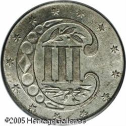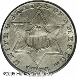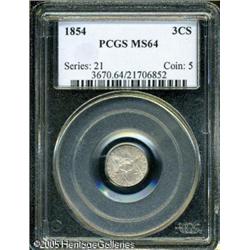 <B>1854 3CS MS65 PCGS.</B></I> The Type Two Trimes of 1854-1858 are the most difficult issues in the series to locate in the finer Mint State grades. As a result, Gem quality survivors are always in demand among high quality type collectors. The first year of this type, the 1854 has a limited original mintage of 671,000 pieces. This is a lovely representative with surfaces that were fortunate enough to survive without acquiring any mentionable abrasions. Light silver-rose patina overlays the otherwise frosty surfaces, a feature that further accentuates the razor sharp striking detail. A few typical clash marks are seen on each side. Population: 30 in 65, 4 finer (1/05). Lot:5647