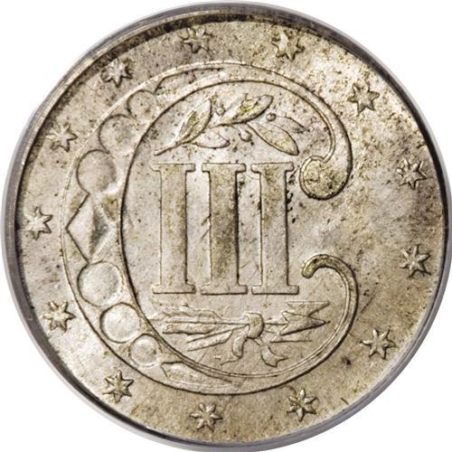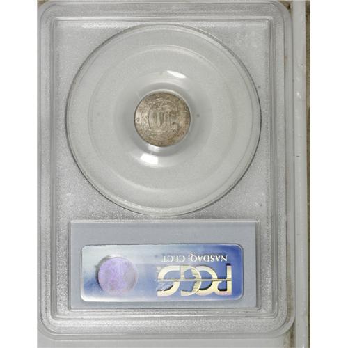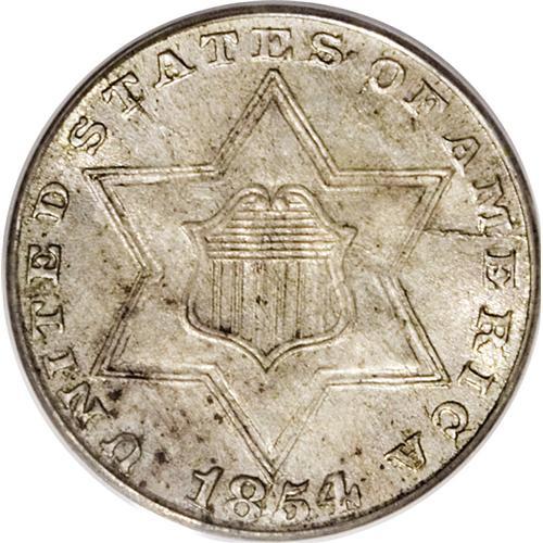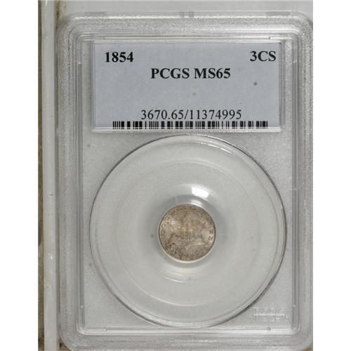 <B>1854 3CS MS65 PCGS.</B></I> This year saw the debut of the Type Two three cent silver design, with a triple border around the obverse star, and an increase in the coin's silver content from 75% to 90%. This piece is well struck with bright satiny luster and several different shades of light, speckled patina on each side. Three faint peripheral die cracks are noted on the obverse, but surface blemishes or distractions are absent. Population: 41 in 65, 8 finer (2/07).<BR><BR><b>Shipping:</b> Coins & Currency (<a target="_blank" href="http://www.heritageauctions.com/common/shipping.php">view shipping information</a>)