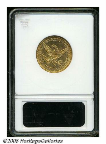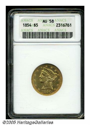 <B>1854<$5> AU58 ANACS.</B></I> Still lustrous, with some scattered deep red color. Some small contact marks are noted, primarily in the fields.