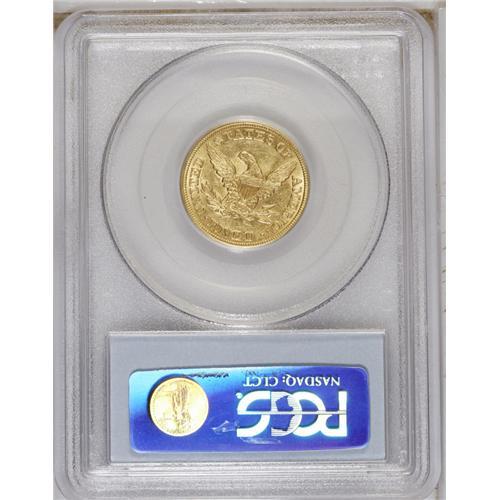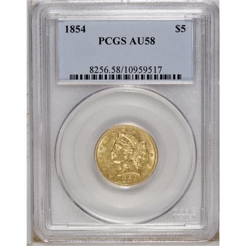 1854 $5 AU58 PCGS. Minor friction appears on the highp