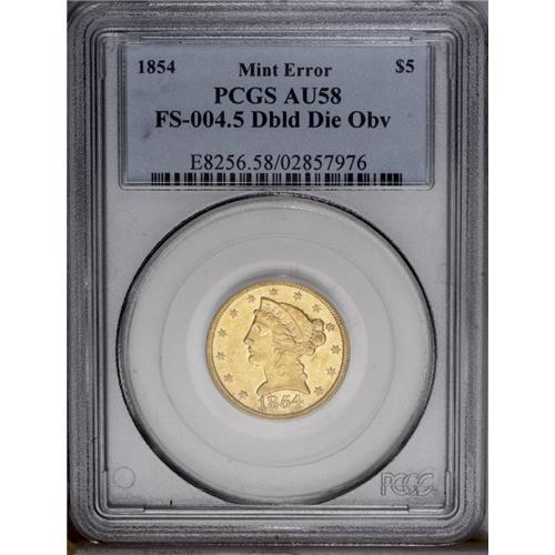 <B>1854<$5> Doubled Die Obverse AU58 PCGS.</B></I> FS-004.5. Liberty's earlobe and nearby hair curl are die doubled with a wide spread. Only the obverse center is doubled, similar to the Breen-2314 1984 Cent. A crisply struck, partly lustrous, and attractive tan-gold piece. <BR><BR><B>Important notice:</B> Heritage usually auctions material at the rate of 200-250 lots per hour. On some occasions eBay Live bid software or the Internet may not be able to keep up with the pace of the auction. We recommend placing a realistic absentee bid now as insurance to avoid disappointment. Occasionally the auctioneer may eliminate or reject an eBay Live bid, and the auctioneer may also reopen a lot after the close of the eBay live bidding (usually because we missed an audience bid), and may reject your bid even if it shows you as the winning bidder. By bidding via eBay Live, you agree that Heritage may award the lot to another bidder at its sole discretion under the circumstances described above or any other reasonable circumstances. Since eBay bids are not shown to us until we open the lot on the floor, we treat those bids just like floor bids. In most cases the floor responds before the eBay bid is presented to us, due to Internet lag time, so for consistency we have made it a policy that floor bids are always considered first over tie eBay live bids. Also please note that all Heritage lots purchased through eBay Live carry a 20% Buyer's Premium. Please make sure you read the Terms and Conditions before you bid. This lot is being auctioned in conjunction with a live floor auction by Heritage Galleries & Auctioneers. All final auction and invoice information will be supplied by Heritage Galleries & Auctioneers, and all other information should be considered preliminary. Lot:2717 <BR><BR><B>Winning Notification and Billing:</B> After the FINAL session in this auction is complete, Heritage will send e-mail and snail mail invoices. This process normally takes several days. All final auction and invoice information will be supplied by Heritage Galleries & Auctioneers, and all other information should be considered preliminary. <BR><BR>This auction will be conducted on a live auction floor and over the Internet through eBay Live. If you choose to place an absentee bid, please take a moment to <font color='#0000ff'><u><a href='http://pages.ebay.com/liveauctions/help/before/laabsentee.html'>learn how eBay Live absentee bidding works</a></u></font><font color='#000000'>
