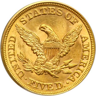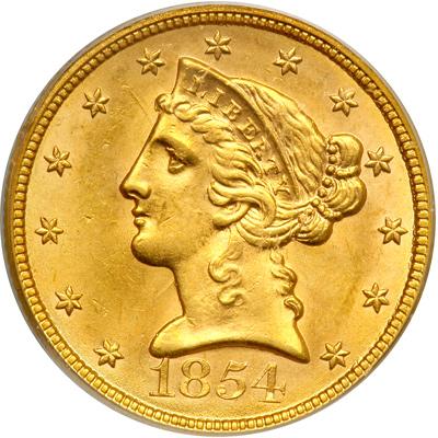 1854 $5 Liberty. PCGS graded MS-63. Well struck and quite choice with delicate golden-sunset toning. Has a faint graze in the frost at the mouth. Dazzling luster with intense cartwheel effects on the satiny surfaces. Nicely struck in almost all areas. Exceedingly choice for the grade. Much rarer in About Uncirculated or finer than its somewhat sizeable mintage of 160,675 pieces suggests. Half Eagles of the day were made strictly for utilitarian purposes, with no numismatic thoughts in mind, which is why within a few years nearly all examples were worn. Pop 8; 2 finer in 64 (PCGS # 8256).