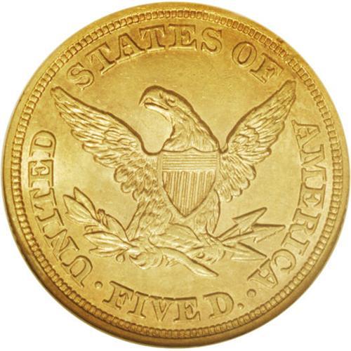 <B>1854<$5> MS62 NGC.</B></I> Beautiful deep orange-red patina, more intense at the rims, covers both sides of this appealing coin and attests to its originality. The strike is pleasing, save for the usual weakness on the arrow feathers. The grade is confirmed by miscellaneous undistracting ticks and light field chatter. Census: 26 in 62, 21 finer (1/06).