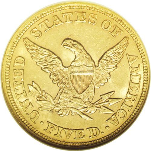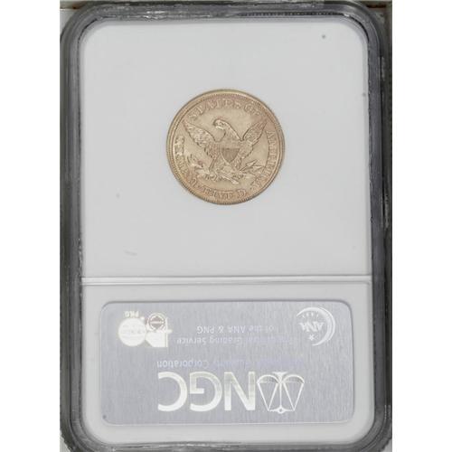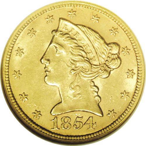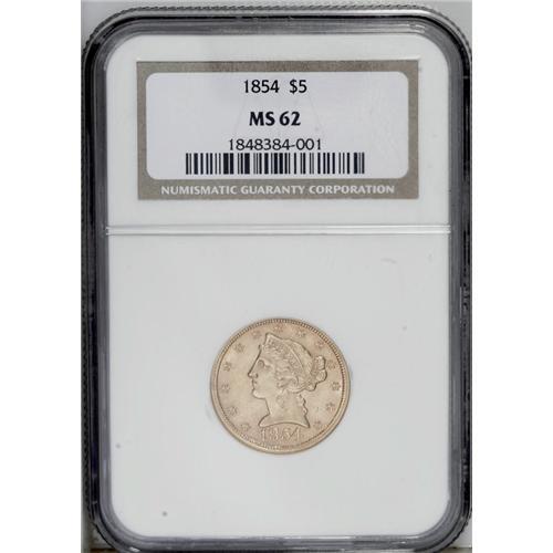 <B>1854<$5> MS62 NGC.</B></I> Because of the lower mintage than other so-called "common" P-mint half eagles of the 1850s, the 1854 is scarce in all grades, and Gem pieces are nonexistent. This specimen offers lovely brownish-gold surfaces with good luster and a bold strike. The few light abrasions noted under a loupe are consistent with the MS62 grade. The 4 in the date nearly touches the five. Census: 19 in 62, 15 finer (9/06).