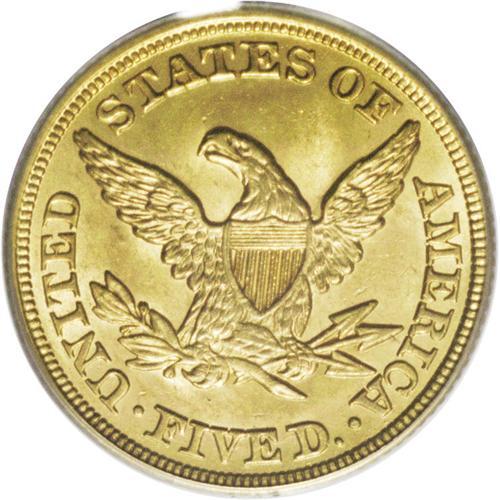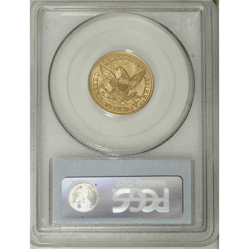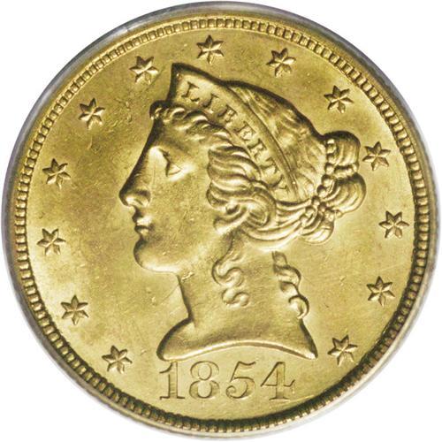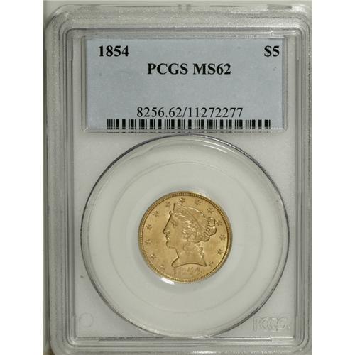 <B>1854 $5 MS62 PCGS.</B></I> A rarer issue in Mint State than the mintage would indicate, usually found in circulated grades. The present specimen offers brownish-gold surfaces with somewhat subdued but still pleasing luster. A few light abrasions and scrapes account for the grade, but the strike is decently executed, and the appeal is considerable. Population: 41 in 62, 11 finer (1/07).<BR><BR><b>Shipping:</b> Coins & Currency (<a target="_blank" href="http://www.heritageauctions.com/common/shipping.php">view shipping information</a>)