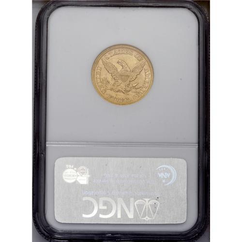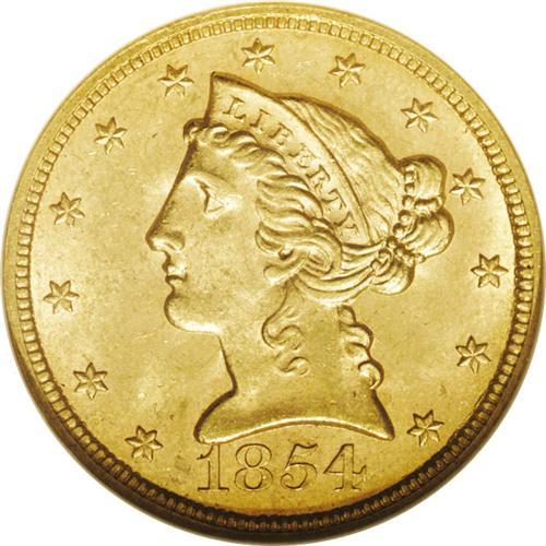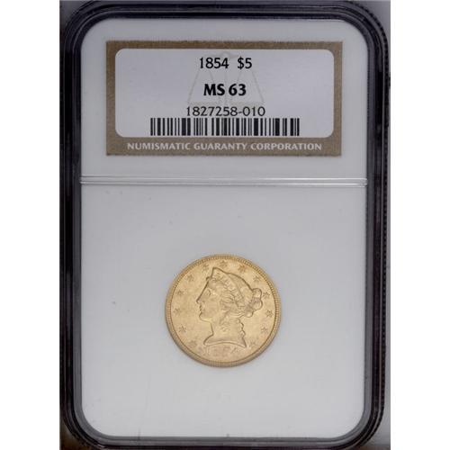 <B>1854 $5 MS63 NGC.</B></I> Satiny and thoroughly original with excellent sharpness save for a trace of obligatory softness on the eagle's neck. Only a few shallow luster grazes can be detected in the fields. The 1854 is significantly scarcer in Mint State than the most common dates from the 1850s such as the 1851 and 1853, but still must be considered one of the more obtainable No Motto fives in top grades. Census: 17 in 63, 4 finer (1/06).