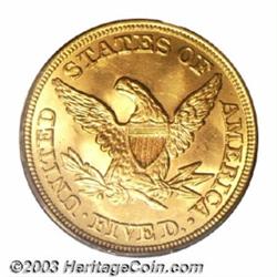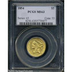 <table><tr><td><TABLE cellSpacing=0 cellPadding=0 width="100%" bgColor=#000000 border=0><TBODY> <TR><TD width="100%"><TABLE cellSpacing=1 cellPadding=3 width="100%" border=0><TBODY><TR><TD width="100%" bgColor=#79735c><FONT face=arial color=#ffffff size=3><B>Description</B> </FONT></TD></TR><TR><TD width="100%" bgColor=#ffffff><FONT face=arial size=2><B>1854 $5 MS63 PCGS.</B></I> The 1854 is seldom seen above the VF-XF grade level, even though 160,675 pieces were struck. It is actually one of the scarcer dates from this decade in Mint State with only five other pieces having been certified as MS63 by PCGS and two finer (10/03). This is a very sharply struck piece that has subdued, satiny luster and no obvious abrasions on either side. </FONT></TD></TR></TBODY></TABLE></TD></TR></TBODY></TABLE><BR><A name=PricesRealized></A><TABLE cellSpacing=0 cellPadding=0 width="100%" bgColor=#000000 border=0><TBODY><TR><TD width="100%"><TABLE cellSpacing=1 cellPadding=3 width="100%" border=0><TBODY><TR><TD width="100%" bgColor=#79735c><A name=PR><FONT face=arial color=#ffffff size=3><B>Previous Prices from Heritage Auctions</B> </FONT></A></TD></TR><TR><TD bgColor=#f6f6ed><TABLE cellSpacing=0 cellPadding=0 width="100%" border=1><TBODY><TR><TD align=middle width="33%"><B>Date</B></TD><TD align=middle width="33%"><B>Service</B></TD><TD align=middle width="33%"><B>Price</B></TD></TR><TR bgColor=whitesmoke><TD width="33%"><B>03/01/2003</B></TD><TD width="33%">PCGS</TD><TD width="33%">$5,750.00</TD></TR></TBODY></TABLE></TD></TR><TR><TD bgColor=#ffffff><FONT face=arial size=1 ?>PLEASE NOTE: All prices realized reflect the final hammer price PLUS the buyer's premium in auctions that charge a buyer's premium. Each item has a notation at the top of the listing indicating whether that lot included a buyer's premium. Example: A item that sells with a final hammer price of $100 and a 20% buyer's premium will display with a price realized of $120. All information listed is intended to be as accurate as possible, but errors are possible. Please use this guide carefully and inform us of any inaccuracies. </FONT></TD></TR></TBODY></TABLE></TD></TR></TBODY></TABLE><BR><TABLE cellSpacing=0 cellPadding=0 width="100%" bgColor=#000000 border=0><TBODY><TR><TD width="100%"><TABLE cellSpacing=1 cellPadding=3 width="100%" border=0><TBODY><TR><TD width="100%" bgColor=#79735c colSpan=6><FONT face=arial color=#ffffff size=3><B>Price Guide*</B> </FONT></TD></TR><TR bgColor=#f6f6ed><TD align=middle><B>Grade</B> </TD><TD align=middle><B>Coin World<BR>(Trends)</B> </TD><TD align=middle><B>Numismedia<BR>Retail</B> </TD><TD align=middle><B>Numismedia<BR>Wholesale</B> </TD><TD align=middle><B>Coin<BR>Universe</B> </TD><TD align=middle><B>Heritage<BR>Value Index</B> </TD></TR><TR bgColor=#ffffff><TD align=middle>62</TD><TD align=right>$4,000.00</TD><TD align=right>---</TD><TD align=right>$3,550.00</TD><TD align=right>$5,200.00</TD><TD align=right>$3,305.01</TD></TR><TR style="FONT-WEIGHT: bold" bgColor=#cccfdd><TD align=middle>63</TD><TD align=right>$11,000.00</TD><TD align=right>---</TD><TD align=right>$8,375.00</TD><TD align=right>$12,000.00</TD><TD align=right>$6,925.00</TD></TR><TR bgColor=#ffffff><TD align=middle>64</TD><TD align=right>$25,000.00</TD><TD align=right>---</TD><TD align=right>---</TD><TD align=right>---</TD><TD align=right>$15,500.00</TD></TR><TR bgColor=#ffffff><TD colSpan=6><FONT size=1>*All information listed is intended to be as accurate as possible, but errors are possible. No item may be returned or refused based on this information which is provided as a service to our customers. You should contact each pricing source directly to determine the accuracy of this information. </FONT></TD></TR></TBODY></TABLE></TD></TR></TBODY></TABLE><BR><TABLE cellSpacing=0 cellPadding=0 width="100%" bgColor=#000000 border=0><TBODY><TR><TD width="100%"><TABLE cellSpacing=1 cellPadding=3 width="100%" border=0><TBODY><TR><TD width="100%" bgColor=#79735c><FONT face=arial color=#ffffff size=3><B>Population Guide</B> </FONT></TD></TR><TR bgColor=#ffffff><TD align=middle><!-- Begin Output of Population Grid--><TABLE cellSpacing=0 cellPadding=0 width="100%" border=0><TBODY><TR><TD vAlign=center><TABLE cellSpacing=0 width="100%" border=1 cellsadding="3"><TBODY><TR><TD vAlign=center><TABLE cellSpacing=0 cellPadding=3 width="100%" border=1><TBODY><TR><TD vAlign=center align=middle bgColor=#f0f1e8 colSpan=2 <CENTER><FONT face=Arial size=2><B>PCGS Pop </B></FONT><CENTER></CENTER></TD><TD vAlign=center align=middle bgColor=#f0f1e8 colSpan=2><CENTER><FONT face=Arial size=2><B>NGC Pop</B></CENTER></FONT></TD></TR><TR><TD vAlign=center><FONT face=Arial size=2>(63)</FONT> </TD><TD vAlign=center align=right><FONT face=Arial size=2>6</FONT> </TD><TD vAlign=center><FONT face=Arial size=2>(63)</FONT> </TD><TD vAlign=center align=right><FONT face=Arial size=2>7</FONT> </TD></TR><TR><TD vAlign=center><FONT face=Arial size=2>(>63)</FONT> </TD><TD vAlign=center align=right><FONT face=Arial size=2>2</FONT> </TD><TD vAlign=center><FONT face=Arial size=2>(>63)</FONT> </TD><TD vAlign=center align=right><FONT face=Arial size=2>3</FONT> </TD></TR></TBODY></TABLE></TD></TR></TBODY></TABLE></TD></TR></TBODY></TABLE><!-- End Output of Population Grid--></TD></TR></TBODY></TABLE></TD></TR></TBODY></TABLE><BR><TABLE cellSpacing=0 cellPadding=0 width="100%" bgColor=#000000 border=0><TBODY><TR> Important notice: Heritage usually auctions material at the rate of 200-250 lots per hour. On some occasions eBay Live bid software or the Internet may not be able to keep up with the pace of the auction. We recommend placing a realistic absentee bid now as insurance to avoid disappointment. Occasionally the auctioneer may eliminate or reject an eBay Live bid, and the auctioneer may also reopen a lot after the close of the eBay live bidding (usually because we missed an audience bid), and may reject your bid even if it shows you as the winning bidder. By bidding via eBay Live