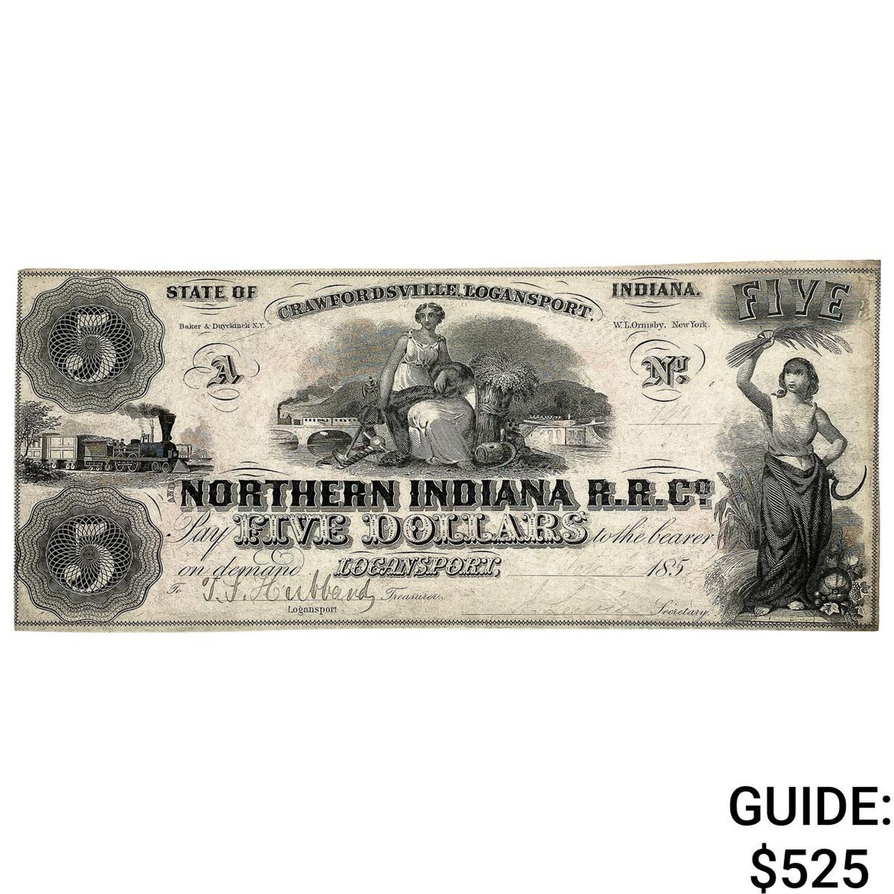 1854 $5 Northern Indiana R.R.C. Note