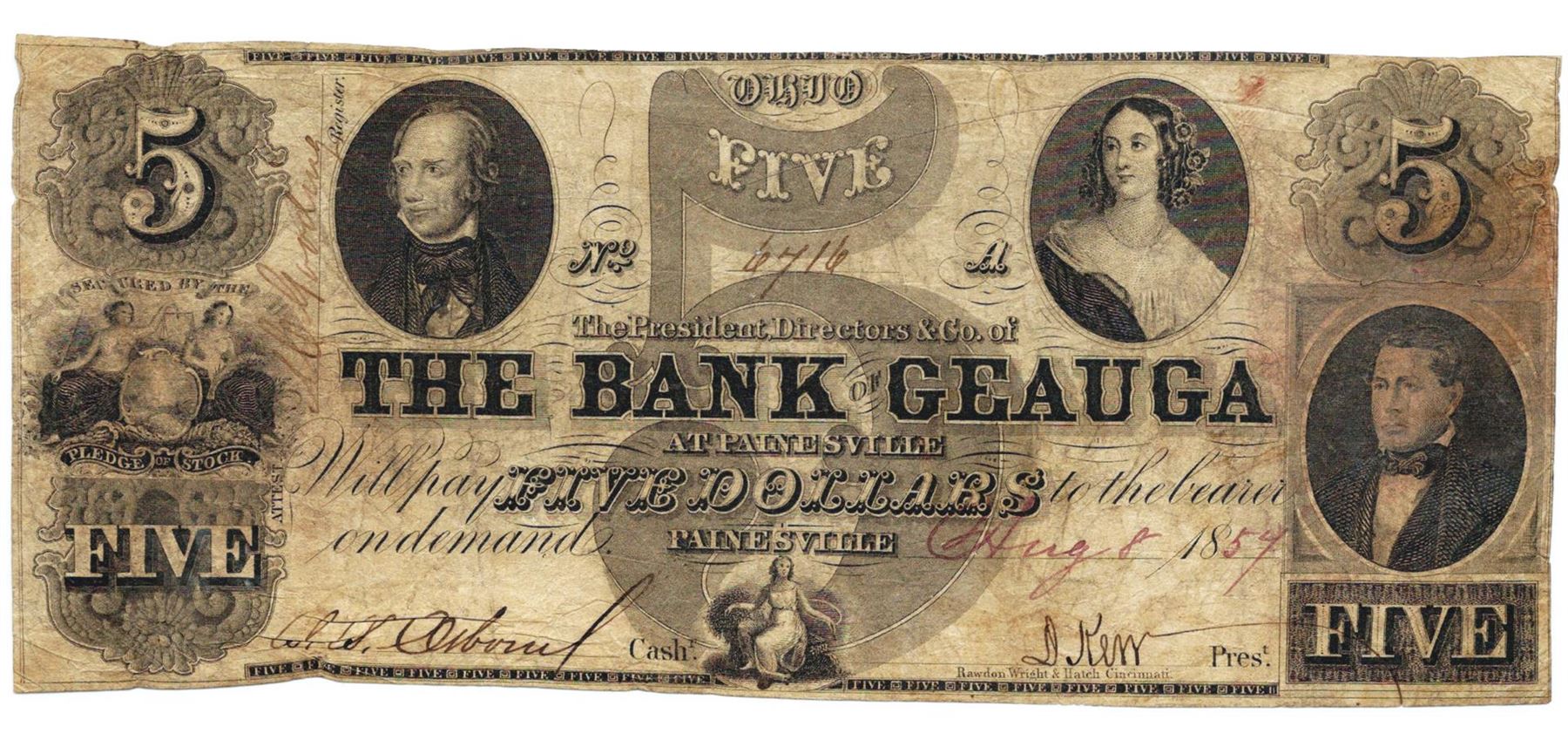 One 1854 $5 The Bank of Geuga, Painesville, OH Bank Note - Pinholes