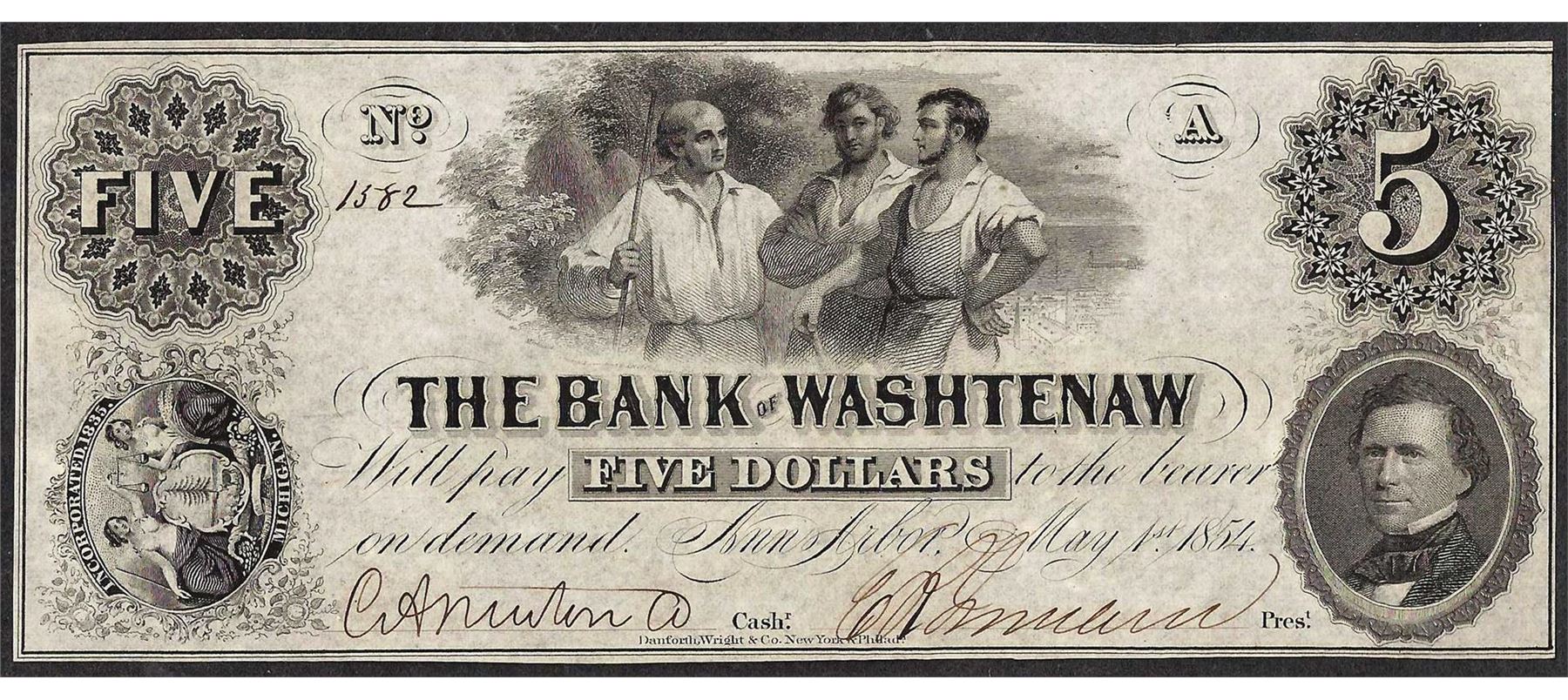 One 1854 $5 The Bank of Washtenaw Obsolete Note.