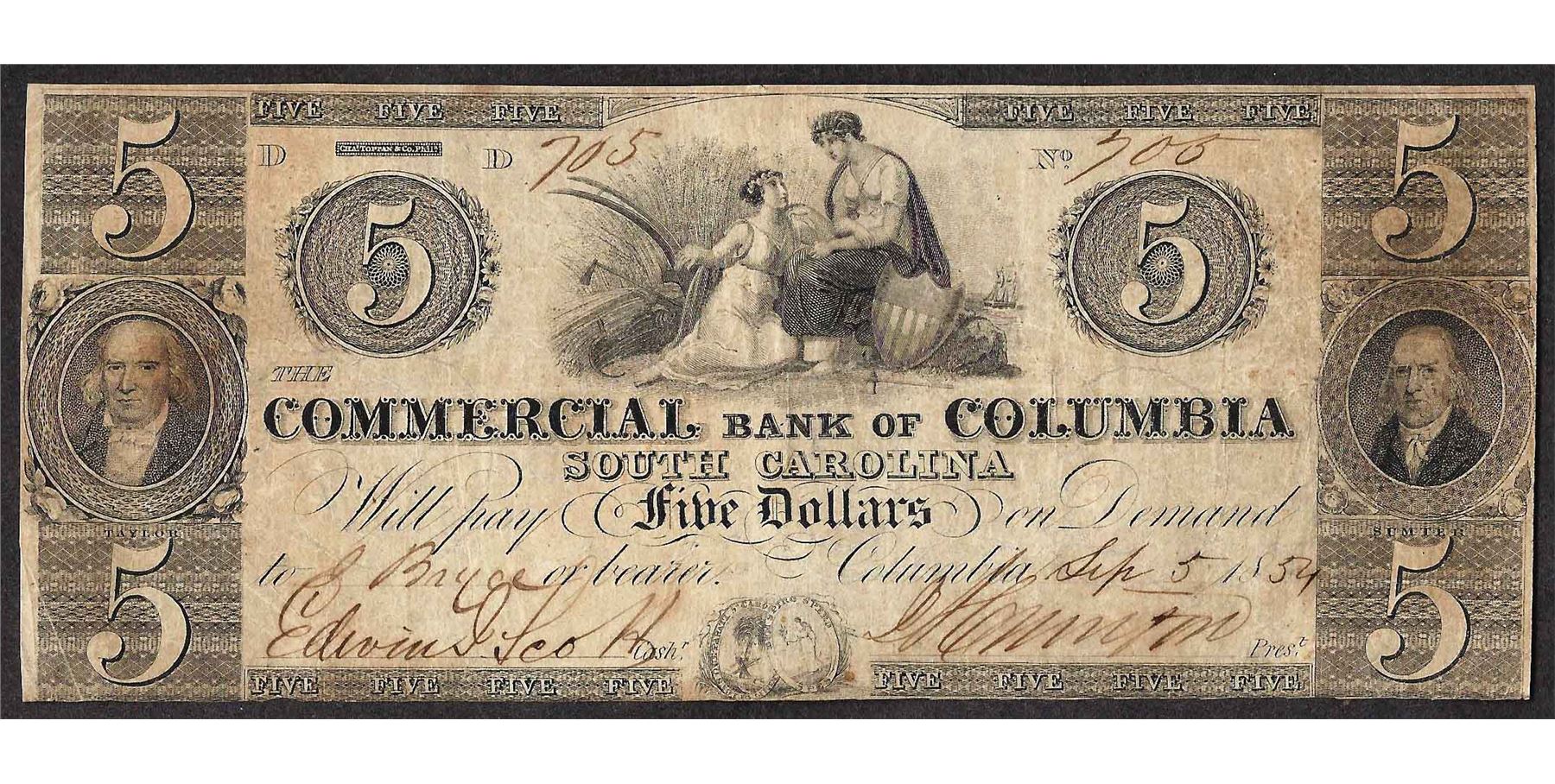 One 1854 $5 The Commercial Bank of Columbia Obsolete Note.