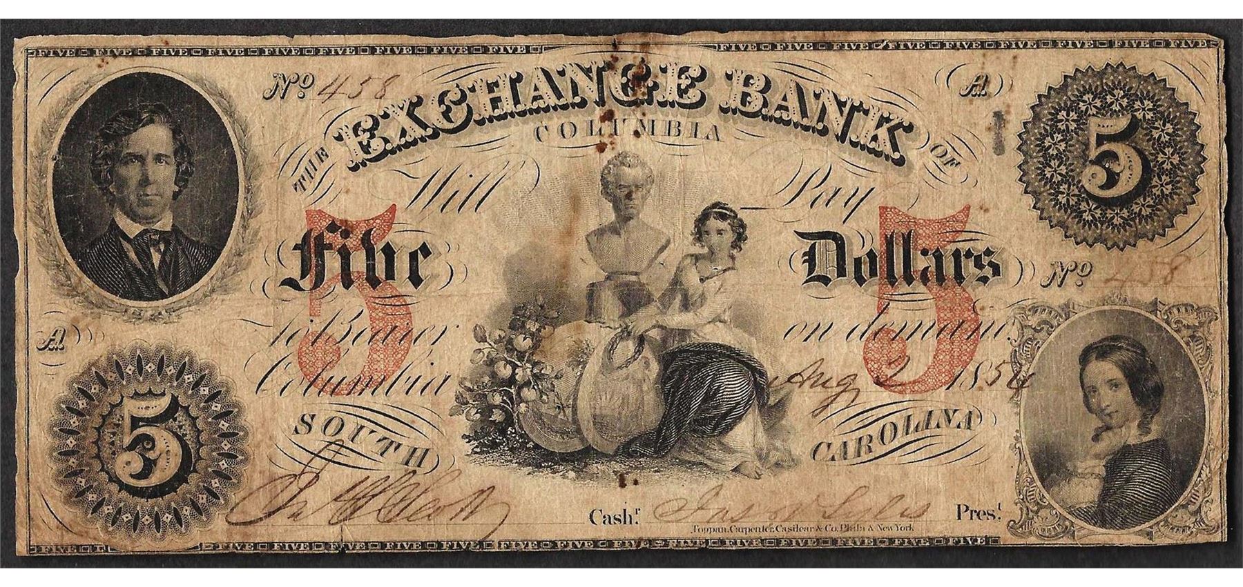 One 1854 $5 The Exchange Bank Columbia, South Carolina Obsolete Note.