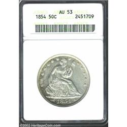 1854 50C Arrows AU53 ANACS. The light, almost brilliant surfaces show faint flecks of other colors o