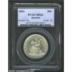1854 50C Arrows MS62 PCGS. Sharply defined, the surfaces are a bit lackluster but each side shows sm