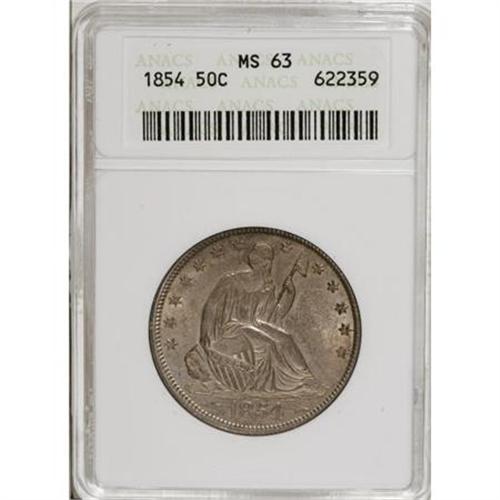 <B>1854 50C Arrows MS63 ANACS.</B></I> Soft luster exudes from light tan-gray surfaces. Generally well struck, and revealing just a few minute marks. Light clash marks are noted on the obverse. While common in circulated grades, Mint State examples are more challenging.<BR><I>From The Casa Becca del Norté Collection.</B></I><BR><BR><B>Coin Engraver:</B> Christian Gobrecht<BR><BR><b>Shipping:</b> Coins & Currency (<a target="_blank" href="http://www.heritageauctions.com/common/shipping.php">view shipping information</a>)