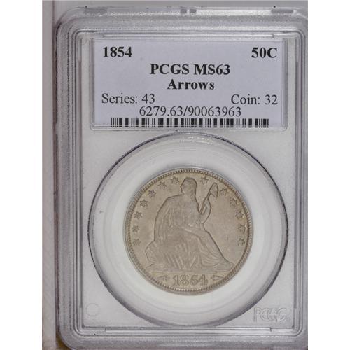 <B>1854<50C> Arrows MS63 PCGS.</B></I> A sharply struck example of this short-lived type that is minimally abraded. Minor die clash marks are evident in the fields, and spindly die cracks occur near the obverse and reverse periphery. Olive-gray toning dominates over both sides, and faint rose accents are noted in the obverse fields. After the initial year of production in 1853 with the Arrows and Rays motif used to signify a reduction in weight on quarters and halves, the rays were dropped from the reverse in 1854 but the arrows were retained on the obverse through 1855, making this a highly desirable item for type collectors. Population: 20 in 63, 46 finer (1/06).