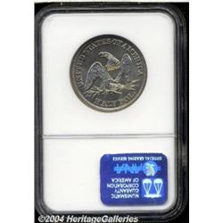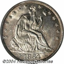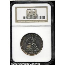 <B>1854<50C> Arrows MS64 NGC.</B></I> Incoming Mint Director Col. James Ross Snowden ordered that the rays that were placed around the eagle on the quarters and half dollars in 1853 to denote their reduction in weight would henceforth be removed, though continuing to show arrows at dates. His reasons for the removal of the rays are likely to have included saving additional cost and time in diesinking, and increasing die life, which had sunk to about 1/3 of its usual level on coins with rays. This near-Gem example features lustrous surfaces that are covered by an even layer of light golden-gray toning. The design elements are boldly struck, revealing razor-sharp detail throughout. A few small marks on Liberty's portrait limit the grade. Population: 40 in 64, 10 finer (7/04). <BR><BR><B>Important notice:</B> Heritage usually auctions material at the rate of 200-250 lots per hour. On some occasions eBay Live bid software or the Internet may not be able to keep up with the pace of the auction. We recommend placing a realistic absentee bid now as insurance to avoid disappointment. Occasionally the auctioneer may eliminate or reject an eBay Live bid, and the auctioneer may also reopen a lot after the close of the eBay live bidding (usually because we missed an audience bid), and may reject your bid even if it shows you as the winning bidder. By bidding via eBay Live, you agree that Heritage may award the lot to another bidder at its sole discretion under the circumstances described above or any other reasonable circumstances. Since eBay bids are not shown to us until we open the lot on the floor, we treat those bids just like floor bids. In most cases the floor responds before the eBay bid is presented to us, due to Internet lag time, so for consistency we have made it a policy that floor bids are always considered first over tie eBay live bids. Also please note that all Heritage lots purchased through eBay Live carry a 20% Buyer's Premium. Please make sure you read the Terms and Conditions before you bid. </span></font></tr></table></td></tr></table>