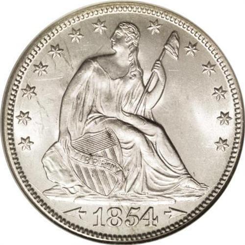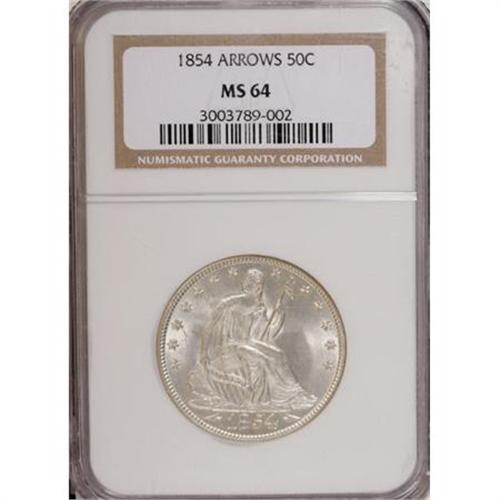 <B>1854 50C Arrows MS64 NGC.</B></I> Wiley and Bugert state that "The dies of this date are not usually found heavily cracked." That does not describe the state of the dies used to strike this coin. It is extensively cracked on the obverse, with only the finest crack through the upper legend on the reverse. The luster on this piece is superlative. It is bright and frosted and rolls around the surfaces as the coin is tilted beneath a light. Brilliant throughout and fully struck, the only mentionable surface flaw is Mint-made, an angling grease stain on the right side of the eagle. Census: 38 in 64, 11 finer (1/08).<BR><BR><B>Coin Engraver:</B> Christian Gobrecht<BR><BR><b>Shipping:</b> Coins & Currency (<a target="_blank" href="http://www.heritageauctions.com/common/shipping.php">view shipping information</a>)