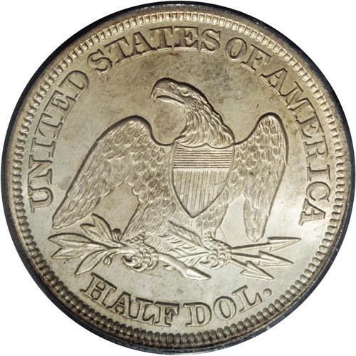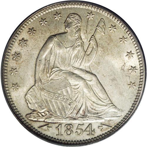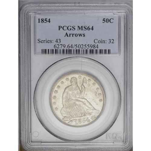 <B>1854<50C> Arrows MS64 PCGS.</B></I> A consistently bold striking that exhibits shimmering luster under light golden-gray patina. There are a few scattered blemishes on the portrait visible under magnification and faint evidence of die clashing to the right. Scarce at this grade level with obvious demand as a two-year type. Population: 36 in 64, 10 finer (3/06). <BR><BR><B>Important notic