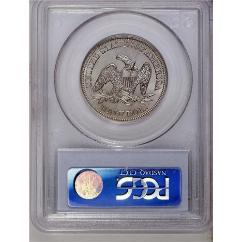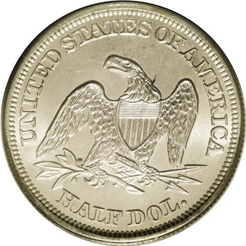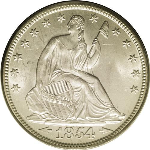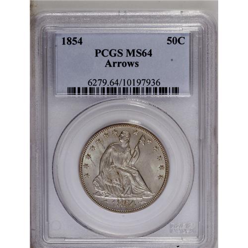 <B>1854<50C> Arrows MS64 PCGS.</B></I> The Philadelphia Mint toiled to produce 1854 Arrows half dollars, since they were needed in commerce to replace hoarded old tenor silver coinage. Although nearly 3 million pieces were struck, these went into circulation, and relatively few have survived with full mint luster. The present sharply struck and brilliant Arrows type coin is uncommonly void of marks, and would likely grade even finer were it not for a slender and inconspicuous mint-made grease streak on the eagle's neck.