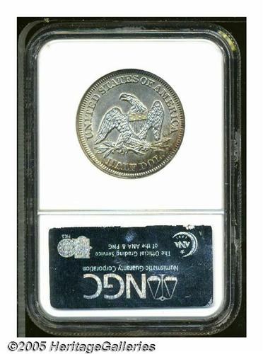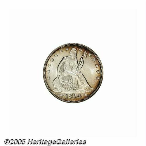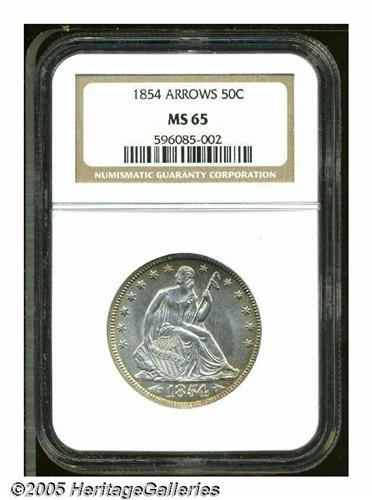 <B>1854<50C> Arrows MS65 NGC.</B></I> Silver-gray surfaces display nice luster and whispers of golden-brown, steel-blue, and lavender patina around portions of the rims. The design elements are sharply impressed, though the star centers along the left (facing) border are a tad soft. Aside from a couple of small marks on Liberty's cheek, the surfaces are well preserved. This is an overall pleasing coin. Population: 7 in 65, 4 finer (6/05).