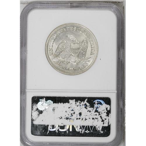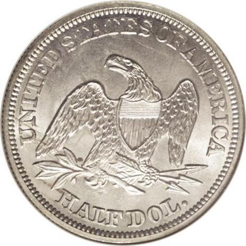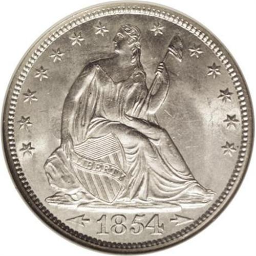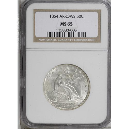 <B>1854<50C> Arrows MS65 NGC.</B></I> This short-lived type rarely appears on the market as a Gem. The luster quality is strong for the assigned grade, shimmering with a softly frosted texture. Abrasions are minimal, although some interesting clashmarks (as struck) are noted in the right obverse field and within the recesses of the reverse shield. Further noted are a planchet void in the obverse field at Liberty's left (facing) hand and several grease stains over the lower left reverse (both are also as produced.) Uncommonly well struck for the type with no ill-defined features. Census: 7 in 65, 4 finer (7/06).