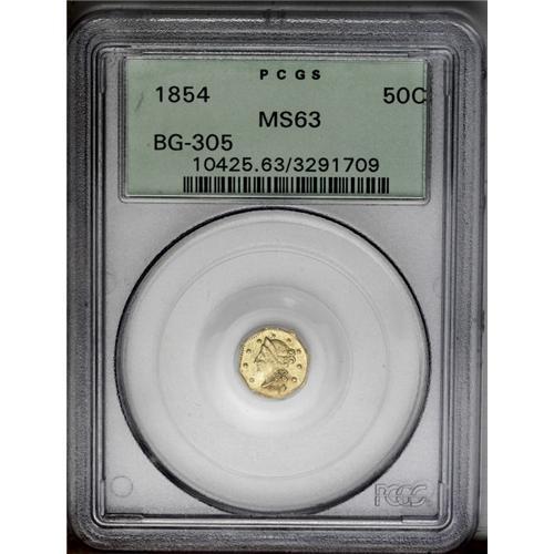 <B>1854<50C> Liberty Octagonal 50 Cents, BG-305, Low R.4, MS63 PCGS.</B></I> An unmarked and slightly buckled example with medium honey-gold toning. Encapsulated in a prior generation holder. Population: 33 in 63, 8 finer (5/06).