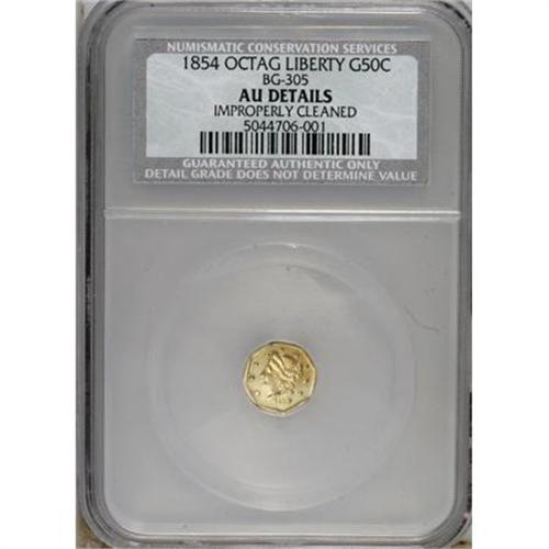 <B>1854 50C Liberty Octagonal 50 Cents, BG-305, Low R.4--Improperly Cleaned--NCS. AU Details.</B></I> NGC Census: (0/12). PCGS Population (0/0). (#10425)<BR><BR><b>Shipping:</b> Coins & Currency (<a target="_blank" href="http://www.heritageauctions.com/common/shipping.php">view shipping information</a>)