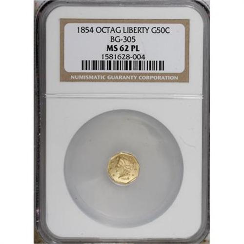 <B>1854 50C Liberty Octagonal 50 Cents, BG-305, Low R.4, MS62 Prooflike NGC.</B></I> NGC Census: (6/6). PCGS Population (27/42). (#10425)<BR><BR><b>Shipping:</b> Coins & Currency (<a target="_blank" href="http://www.heritageauctions.com/common/shipping.php">view shipping information</a>)