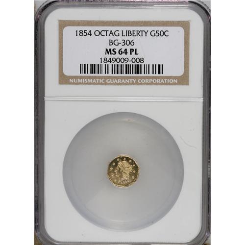 <B>1854 50C Liberty Octagonal 50 Cents, BG-306, R.4, MS64 Prooflike NGC.</B></I> This prominently mirrored piece has a bold strike and displays consistent yellow-gold. A few faint reverse marks are only visible with a glass. Census: 1 in 64, 3 finer (3/07).<BR><BR><b>Shipping:</b> Coins & Currency (<a target="_blank" href="http://www.heritageauctions.com/common/shipping.php">view shipping information</a>)