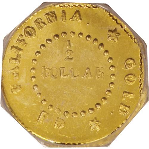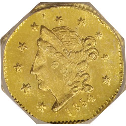 <B>1854 50C Liberty Octagonal 50 Cents, BG-306, R.4, MS66 PCGS.</B></I> A gorgeous Premium Gem with brightly reflective sun-gold fields. Thorough evaluation beneath a loupe fails to locate any remotely relevant imperfections. This Breen-Gillio variety is credited to Frontier, Deviercy & Co., San Francisco jewelers and watch makers during the Period One era. Unsurpassed in grade at either major grading service.<BR><BR><b>Shipping:</b> Coins & Currency (<a target="_blank" href="http://www.heritageauctions.com/common/shipping.php">view shipping information</a>)