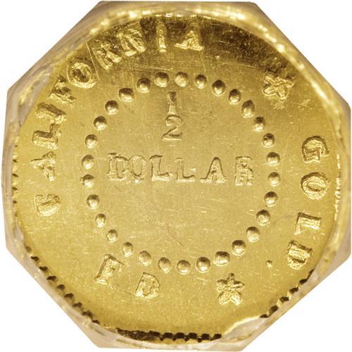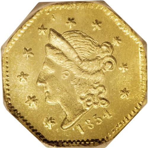 <B>1854 50C Liberty Octagonal 50 Cents, BG-306, R.4, MS66 Prooflike NGC.</B></I> The dazzling, flashy fields are unblemished, and the strike is consistent throughout. Lower relief portions of Liberty's hair are absent, as made from a lapped die. The initials FD represent Frontier, Deviercy & Co., a Period One maker best known for the popular Peacock reverses. BG-306 instead uses a beaded circle and two small stars to demonstrate the reverse design. Census: 2 in 66 Prooflike, 0 finer (4/07).<BR><I>From The Diamond K Collection of California Fractional Gold.</B></I><BR><BR><b>Shipping:</b> Coins & Currency (<a target="_blank" href="http://www.heritageauctions.com/common/shipping.php">view shipping information</a>)